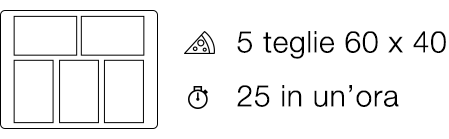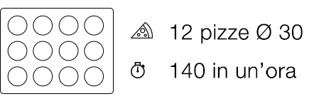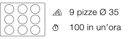 Le sue ampie dimensioni permettono la cottura di più pizze contemporaneamente (es. 9 pizze Ø 35). La sua potenza e l’ottimo isolamento assicurano una notevole velocità di cottura.