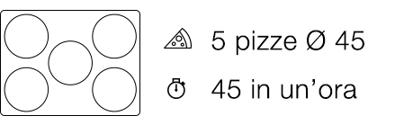 Le sue ampie dimensioni permettono la cottura di più pizze contemporaneamente (es. 9 pizze Ø 35). La sua potenza e l’ottimo isolamento assicurano una notevole velocità di cottura.