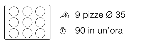 Perfetto per una produzione intensa. Il modello più grande cuoce contemporaneamente 9 pizze Ø 35 cm, 4 pizze Ø 45 cm oppure 4 teglie 60×40 cm.